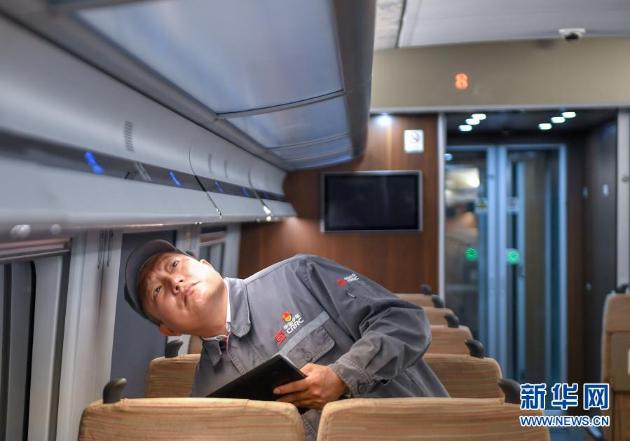 11月25日,在中車長(zhǎng)春軌道客車股份有限公司高速動(dòng)車組制造中心調(diào)試車間,羅昭強(qiáng)檢查復(fù)興號(hào)高鐵列車內(nèi)的電氣系統(tǒng)。新華社記者 張楠 攝