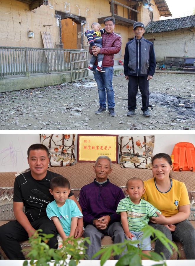 上圖:在江西,村民胡尚海抱著兒子和父親在舊屋前合影(2017年11月攝,資料照片)。下圖:胡尚海一家在安置點(diǎn)的住房內(nèi)合影(5月21日攝,新華社記者 彭昭之 攝)