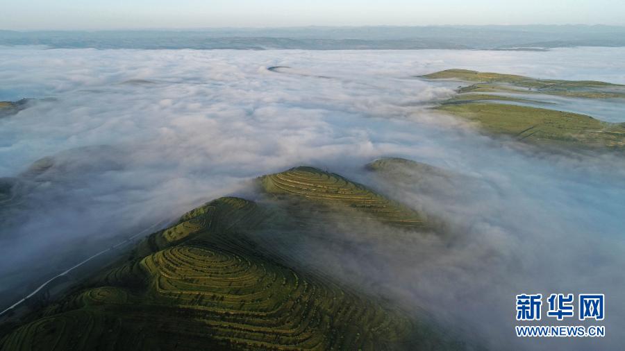 這是2018年7月17日拍攝的云霧繚繞的寧夏彭陽縣金雞坪梯田公園(無人機(jī)照片)。新華社記者 王鵬 攝