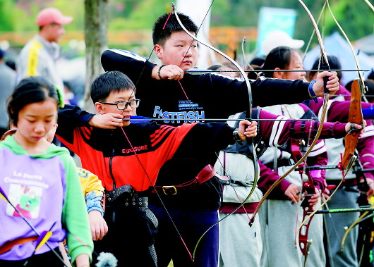 圖2:10月25日,小朋友在2020南京體育嘉年華射箭比賽前練習(xí)。 新華社記者季春鵬攝