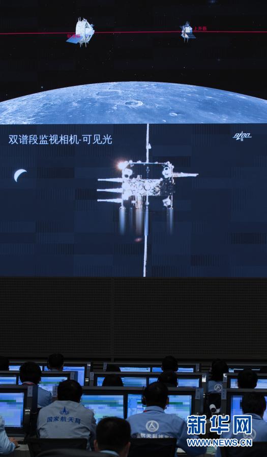 記者從國家航天局獲悉,12月6日5時(shí)42分,嫦娥五號上升器成功與軌道器返回器組合體交會對接,并于6時(shí)12分將月球樣品容器安全轉(zhuǎn)移至返回器中。這是我國航天器首次實(shí)現(xiàn)月球軌道交會對接。新華社記者 金立旺 攝