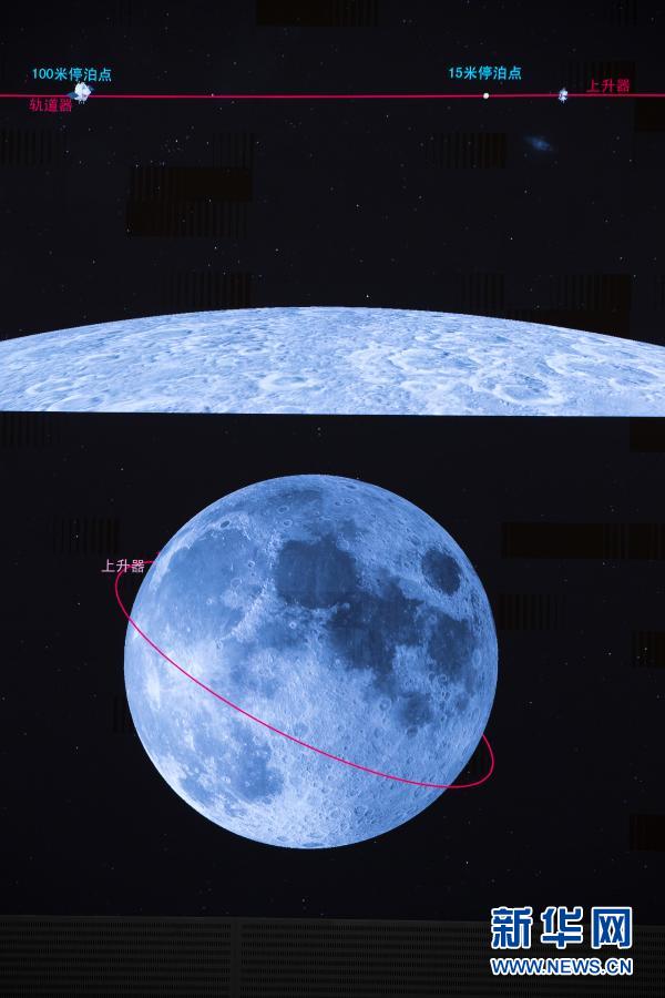 這是12月6日在北京航天飛行控制中心指揮大廳拍攝的嫦娥五號上升器與軌道器返回器組合體交會對接畫面。