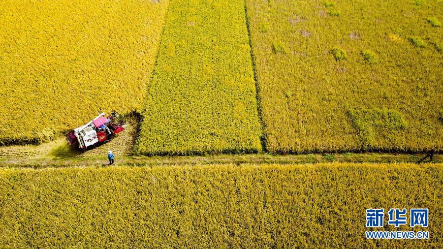 10月21日,在棗莊市臺(tái)兒莊區(qū)邳莊鎮(zhèn),收割機(jī)在收獲水稻(無(wú)人機(jī)照片)。