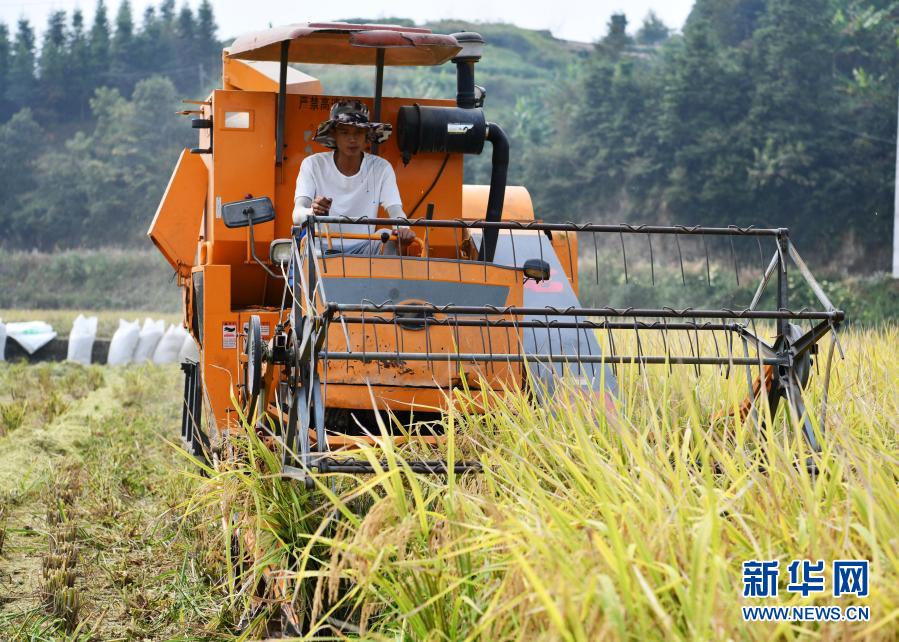 貴州省天柱縣高釀鎮(zhèn)上花村的農民在駕駛收割機收割水稻(9月2日攝)。