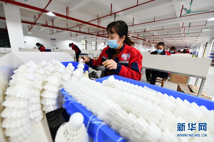 工人在位于貴州省錦屏縣敦寨鎮(zhèn)的貴州亞獅龍體育文化產業(yè)發(fā)展有限公司羽毛球加工廠工作(3月12日攝)。新華社記者 楊文斌 攝