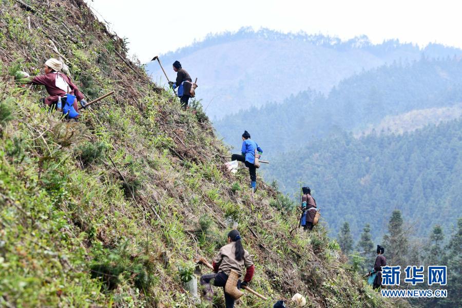 村民在貴州省錦屏縣春蕾林場的山坡上植樹(3月12日攝)。新華社記者 楊文斌 攝