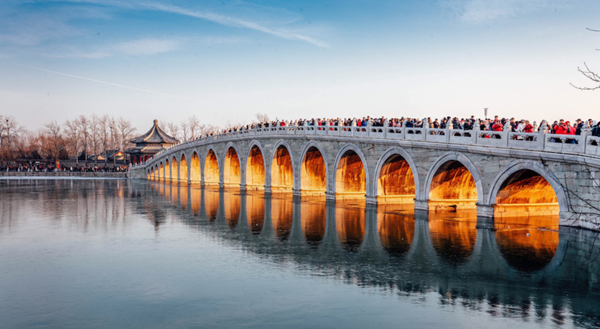 每年冬至前后北京頤和園十七孔橋都會(huì)出現(xiàn)“ 金光穿洞 ”奇觀