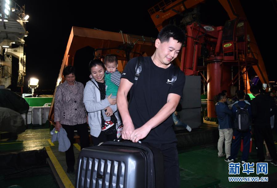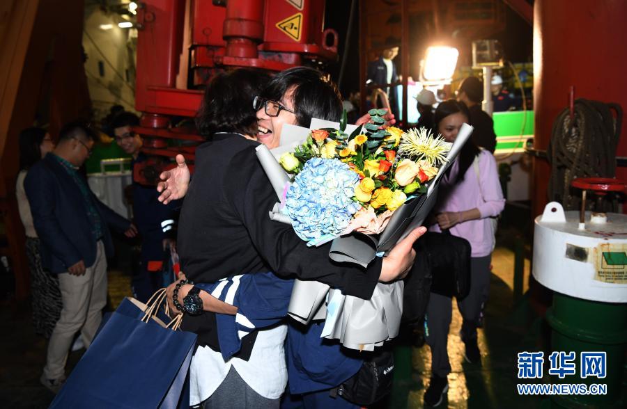 12月21日,“奮斗者”號海試保障母船“探索二號”靠泊三亞,科考隊(duì)員和前來迎接的家屬一起離船。新華社記者 趙穎全 攝