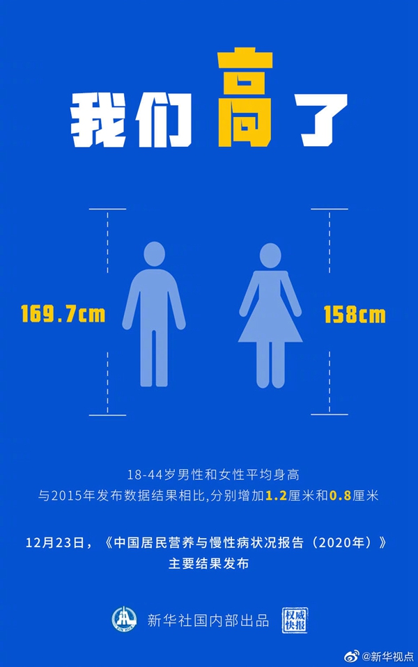 你的營養(yǎng)和健康情況怎樣?高了?身體倍棒?12月23日,一份關乎你我的健康大數(shù)據(jù)重磅上新,《中國居民營養(yǎng)與慢性病狀況報告(2020年)》主要結果發(fā)布——成人平均身高繼續(xù)增長,營養(yǎng)不足問題得到改善,健康意識逐步增強。(記者:陳聰,海報設計:張晨光) ????