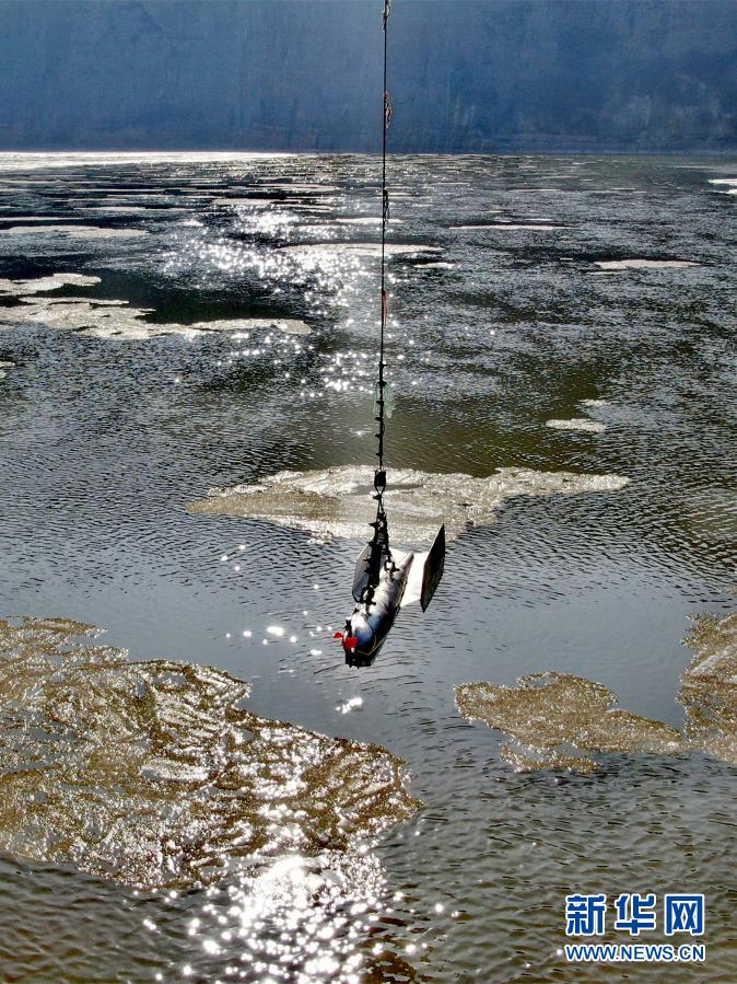 龍門水文站工作人員利用鉛魚纜道進(jìn)行流量測驗(12月27日攝,無人機(jī)照片)。新華社記者 劉詩平 攝