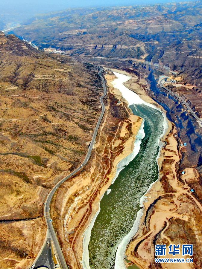 壺口瀑布至龍門水文站之間的黃河(12月26日攝,無人機(jī)照片)。新華社記者 劉詩平 攝