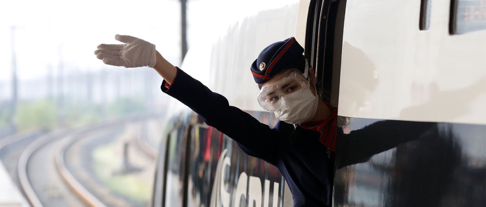在武漢站,G431次列車(chē)乘務(wù)員艾婷婷在發(fā)車(chē)前向乘客揮手(4月8日攝)。