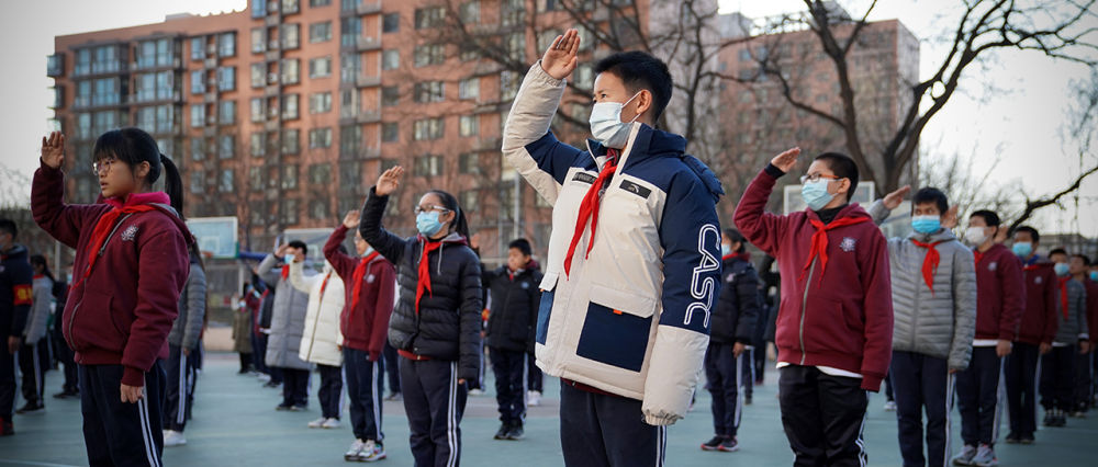 在北京四中廣外校區(qū),蔡昊霖(前)和同學(xué)一起參加升旗儀式(12月21日攝)。