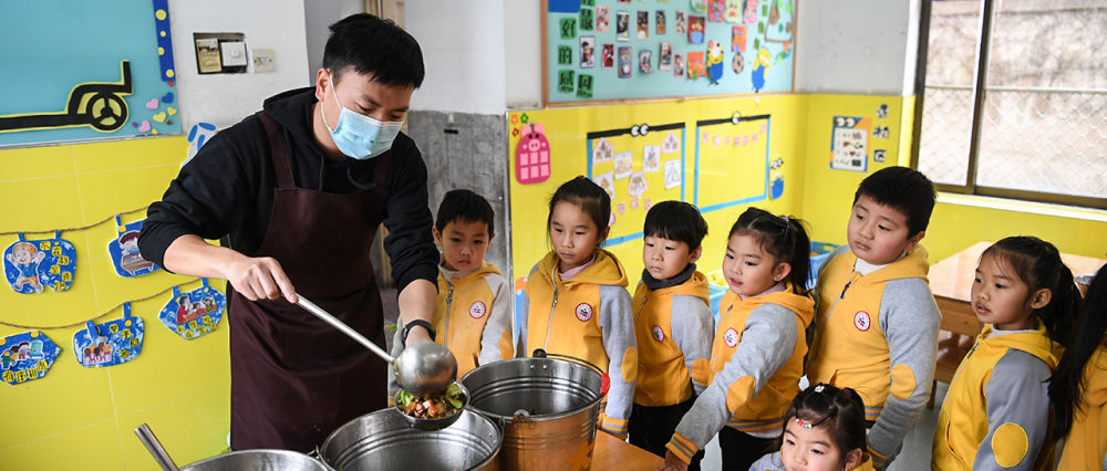孫浩在合肥鋼鐵集團(tuán)第一幼兒園為孩子們打飯菜(12月18日攝)。