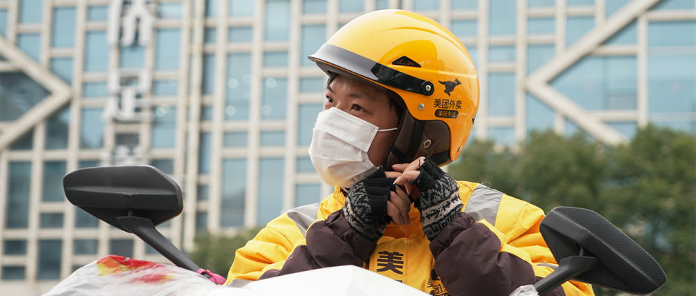 外賣(mài)小哥陳凱,戴著口罩,為陌生的人們運(yùn)送著米面油鹽和一日三餐。