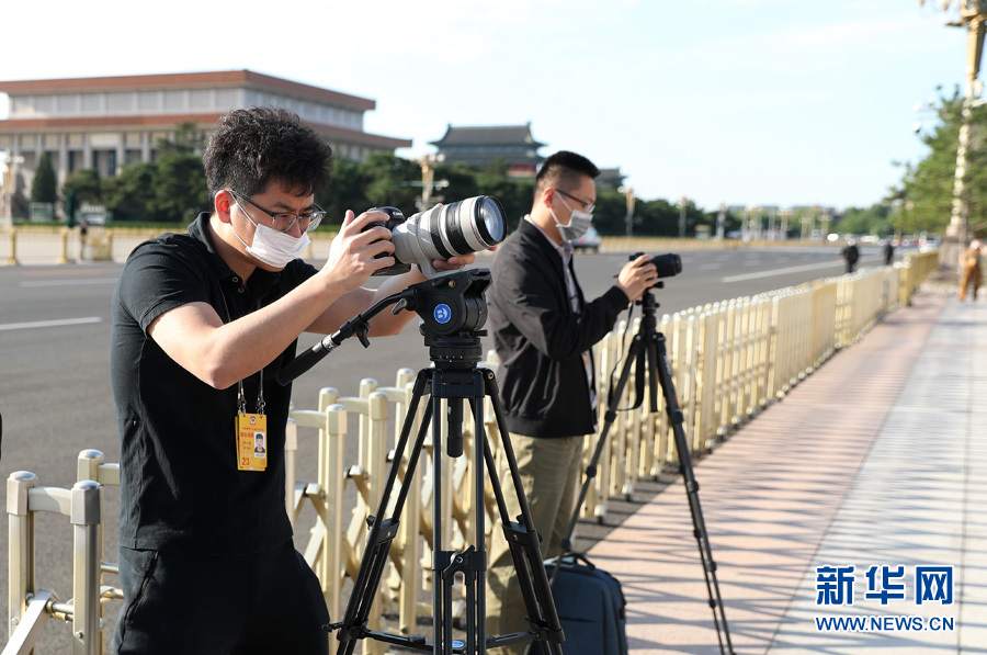 ??? 5月24日,全國政協(xié)十三屆三次會議第二次全體會議在人民大會堂舉行。圖為媒體記者在人民大會堂東門外拍攝。新華網(wǎng) 翟子赫 攝