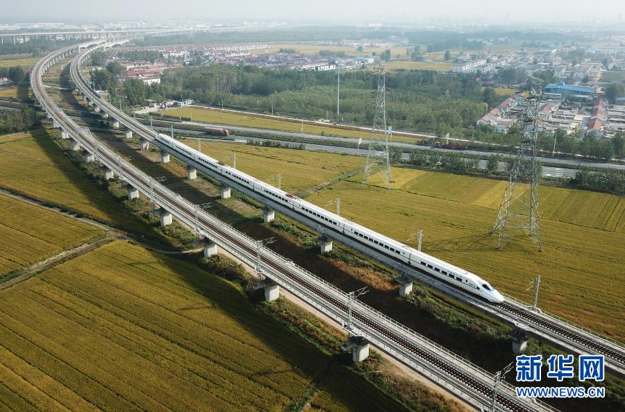 2020年10月10日,一列動車組列車行駛在江蘇連云港市境內(nèi)(無人機(jī)照片)。