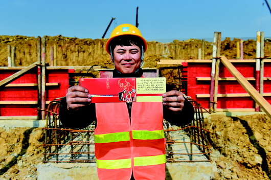 記者見到他時,他穿著橙色馬甲,戴著黃色安全帽,蹲在地上仔細(xì)地扎著打地基要用的鋼筋架:一根根鐵絲牢牢綁在鋼筋的接合處,給鋼筋的強(qiáng)度加碼。