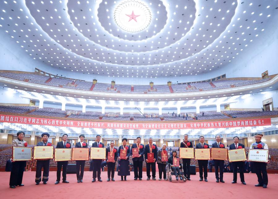 照片上,人民大會堂大禮堂標(biāo)志性的璀璨天頂,燦若星河。剛剛受到表彰的全國脫貧攻堅(jiān)楷模榮譽(yù)稱號獲得者,胸戴獎?wù)?、大紅花,手捧證書、獎牌,聚攏在一起。