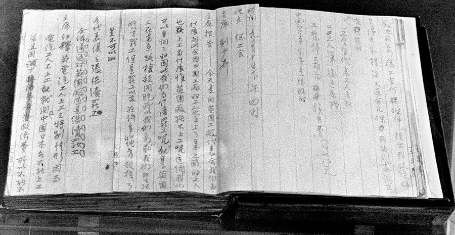 圖為五卅運動期間劉少奇同志召集上海英國工廠工人代表開會的一份會議記錄,會議一致通過對英國工廠繼續(xù)罷工 新華社圖片