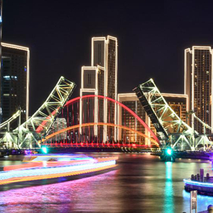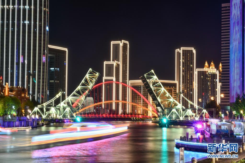 這是5月1日晚拍攝的天津解放橋景觀(長(zhǎng)時(shí)間曝光照片)。新華社發(fā)(孫凡越 攝)