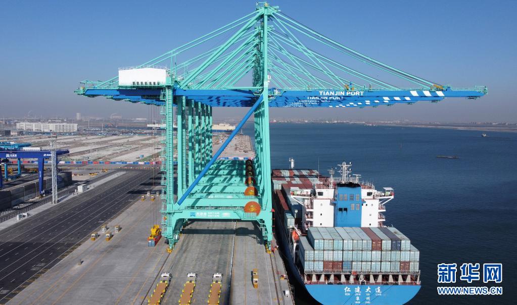這是2021年1月17日拍攝的天津港北疆港區(qū)C段智能化集裝箱碼頭一號(hào)泊位(無(wú)人機(jī)照片)。新華社記者趙子碩 攝