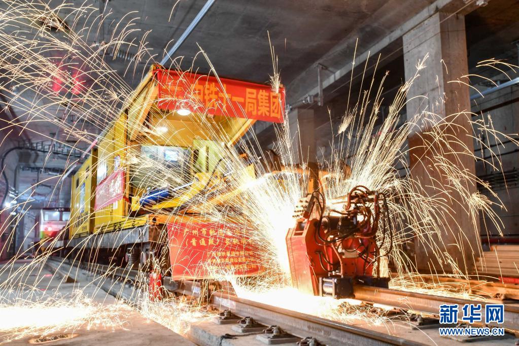 中鐵十一局軌道焊機(jī)在焊接廣州地鐵18號線首通段最后一個(gè)鋼軌接頭(2021年4月20日攝)。新華社記者 劉大偉 攝