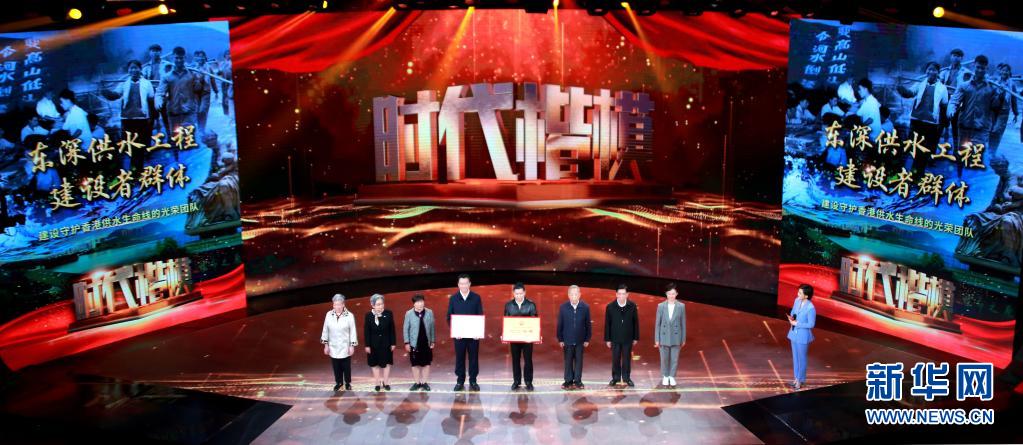 東深供水工程建設(shè)者群體代表在“時(shí)代楷?!卑l(fā)布儀式上領(lǐng)取“時(shí)代楷模”獎牌和證書(2021年4月18日攝)。新華社記者 潘旭 攝