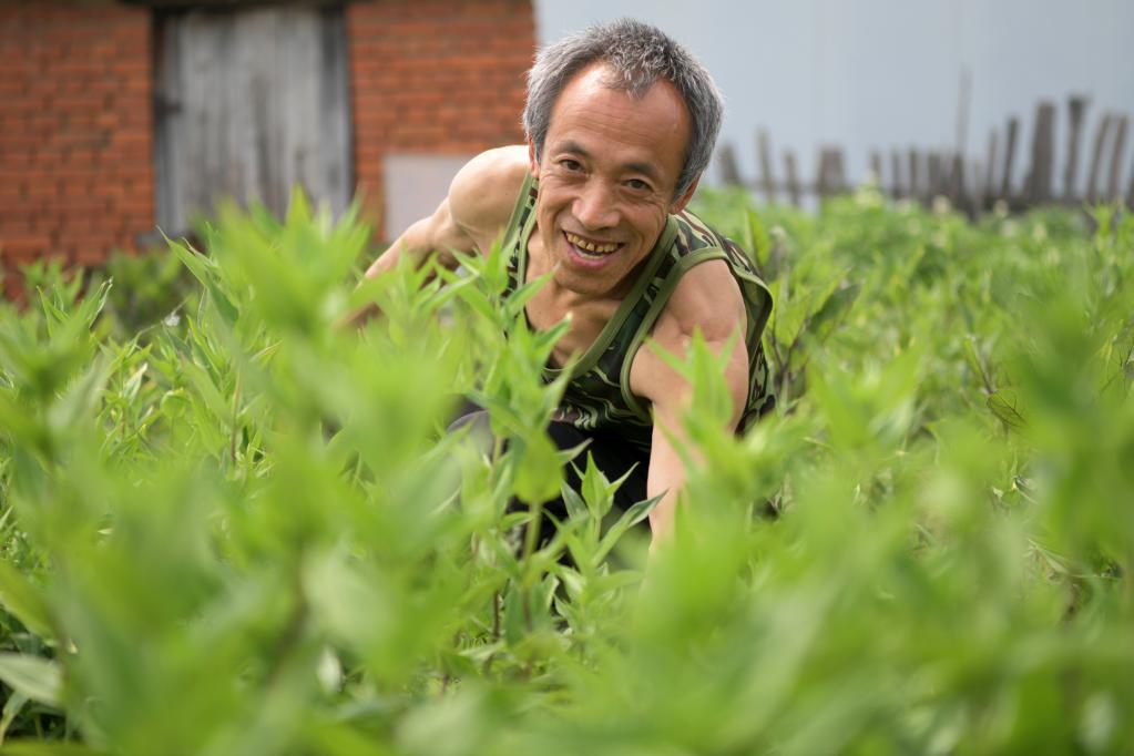5月15日,黑龍江省望奎縣海豐鎮(zhèn)恭頭一村脫貧戶邊志富在中藥材基地勞作。過去,恭頭一村村民以種地為主,村里沒有產(chǎn)業(yè)。駐村工作隊帶領村民走出一條適合當?shù)氐闹兴幉漠a(chǎn)業(yè)之路。