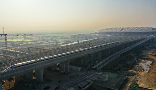 2020年12月27日,從雄安開往北京西的首發(fā)列車駛離雄安站(無人機(jī)照片)。當(dāng)日,北京至雄安新區(qū)城際鐵路大興機(jī)場至雄安新區(qū)段開通運(yùn)營,京雄城際鐵路實現(xiàn)全線貫通,雄安站同步投入使用。新華社記者牟宇攝