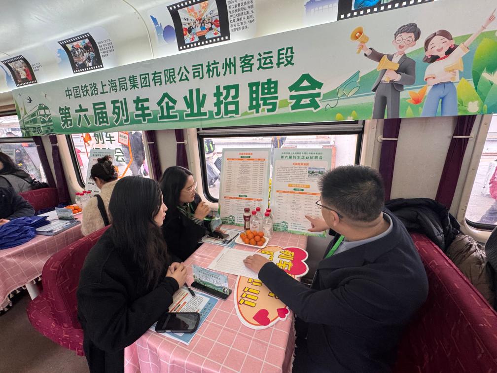 “求才求职来浙江,共同富裕咱助力……”3月4日,伴随着清脆的快板声和智能机器人的互动介绍,中国铁路上海局集团有限公司杭州客运段第六届列车企业招聘会,在K210次列车上再度举办。