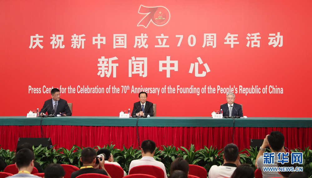 9月27日,慶祝中華人民共和國成立70周年活動新聞中心在梅地亞中心二層新聞發(fā)布廳舉辦第三場新聞發(fā)布會,中央農(nóng)村工作領(lǐng)導(dǎo)小組辦公室主任、農(nóng)業(yè)農(nóng)村部部長韓長賦,國務(wù)院扶貧開發(fā)領(lǐng)導(dǎo)小組辦公室主任劉永富介紹全面建成小康社會,扎實推進(jìn)脫貧攻堅和鄉(xiāng)村振興,并回答記者提問。圖為發(fā)布會現(xiàn)場。新華網(wǎng) 陳杰 攝