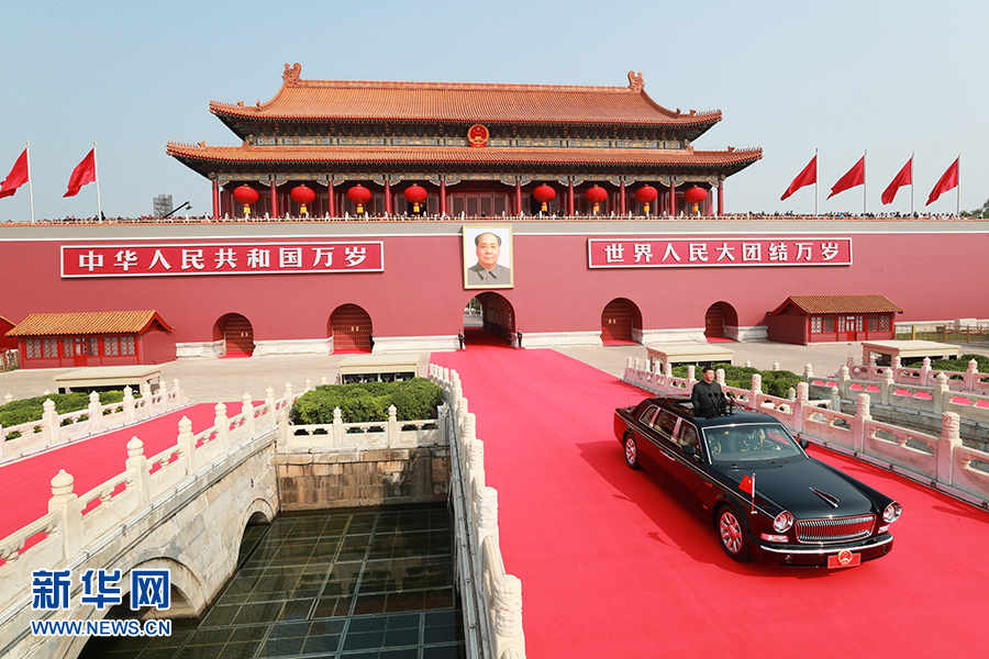 10月1日,慶祝中華人民共和國成立70周年大會(huì)在北京天安門廣場隆重舉行。中共中央總書記、國家主席、中央軍委主席習(xí)近平發(fā)表重要講話并檢閱受閱部隊(duì)。這是習(xí)近平乘坐檢閱車,經(jīng)過金水橋,駛上長安街。 新華社記者 龐興雷 攝
