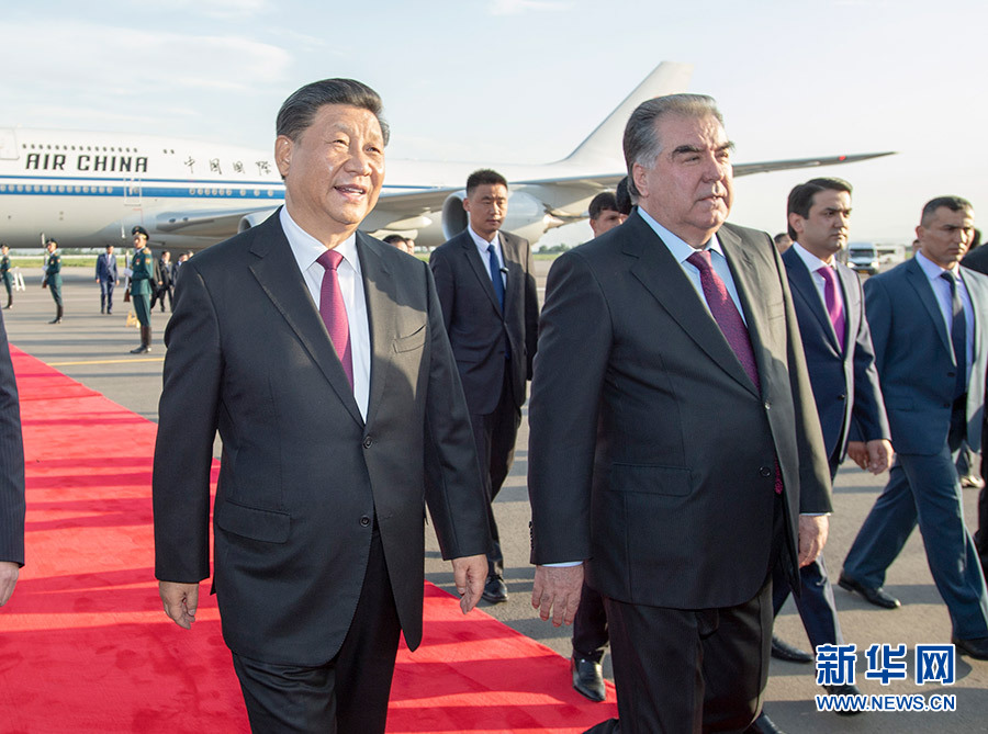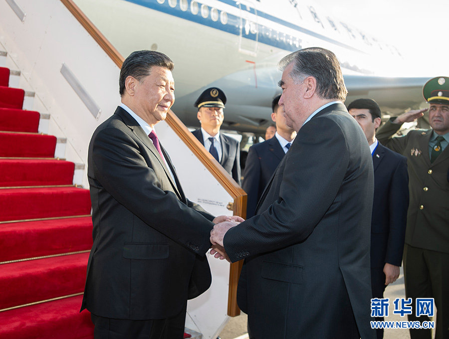 當(dāng)?shù)貢r間晚6時許,習(xí)近平乘坐的專機抵達杜尚別國際機場。習(xí)近平步出艙門,受到塔吉克斯坦總統(tǒng)拉赫蒙熱情迎接。塔吉克斯坦女青年向習(xí)近平獻花。禮兵分列紅地毯兩側(cè)。