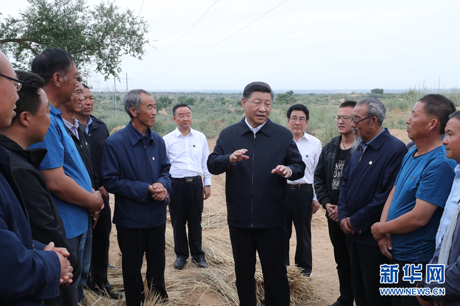 8月19日至22日,中共中央總書記、國家主席、中央軍委主席習近平在甘肅考察。這是21日上午,習近平在武威市古浪縣八步沙林場同“六老漢”代表及林場職工親切交談。 新華社記者 鞠鵬 攝