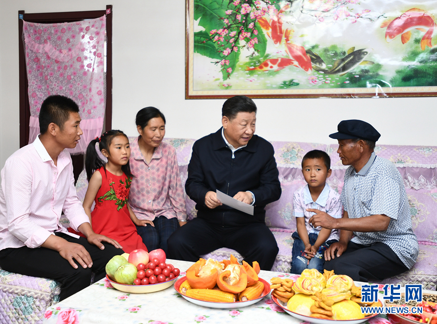 8月19日至22日,中共中央總書記、國家主席、中央軍委主席習近平在甘肅考察。這是21日上午,習近平在武威市古浪縣黃花灘生態(tài)移民區(qū)富民新村村民李應川家,同李應川一家拉家常。 新華社記者 謝環(huán)馳 攝