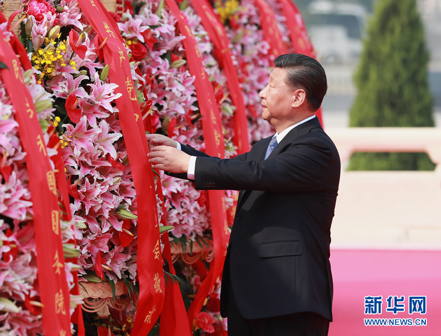 9月30日上午,習近平、李克強、栗戰(zhàn)書、汪洋、王滬寧、趙樂際、韓正、王岐山等黨和國家領導人來到北京天安門廣場,出席烈士紀念日向人民英雄敬獻花籃儀式。這是習近平整理花籃上的緞帶。 新華社記者 龐興雷 攝