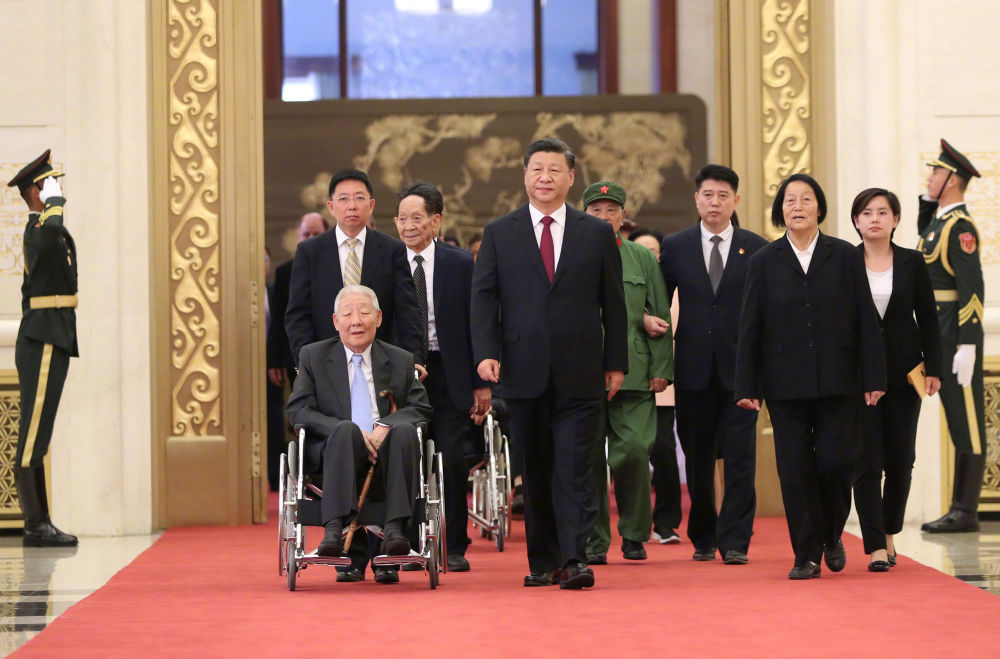 ?萬眾矚目之下,習(xí)近平總書記同他們一同步入會場。在雄壯激昂的《向祖國致敬》樂曲聲中,總書記為他們一一頒授勛章獎?wù)?,親切握手、表示祝賀。