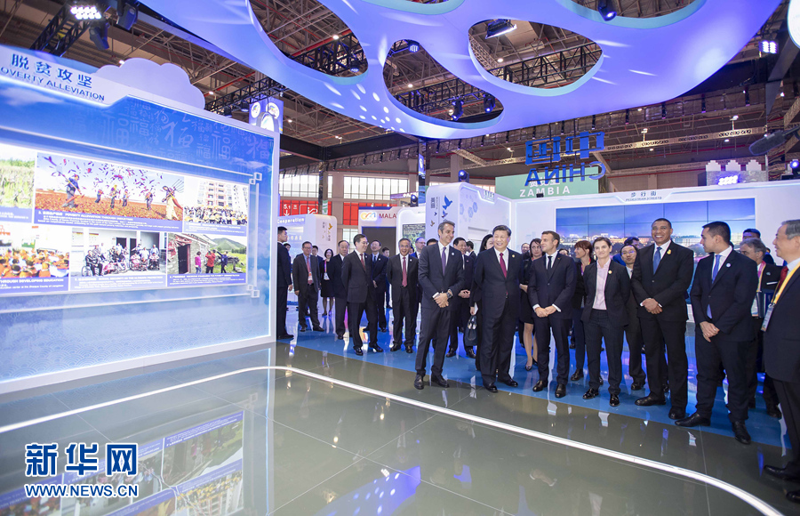 中外領(lǐng)導(dǎo)人饒有興趣地邊走邊看。習(xí)近平走進部分國家展館。坦桑尼亞的腰果,希臘的美食和藝術(shù)品,意大利的葡萄酒,牙買加的藍山咖啡、朗姆酒蛋糕,印度尼西亞的棕櫚油,俄羅斯的新型直升機和汽車,琳瑯滿目。