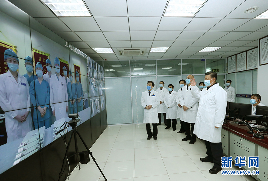 自今年1月12日起,首都醫(yī)科大學(xué)附屬北京地壇醫(yī)院開始承擔(dān)新冠肺炎患者的救治、篩查、隔離工作,收治了北京市第一例確診病例。習(xí)近平來到地壇醫(yī)院門診樓一層運(yùn)行監(jiān)控中心,通過監(jiān)控畫面察看患者住院診療情況,并視頻連線正在病房值班的醫(yī)務(wù)人員,鼓勵(lì)他們繼續(xù)完善診療方案,繼續(xù)全力以赴救治患者,努力提高收治率和治愈率、降低感染率和病亡率,并叮囑他們做好自我防護(hù)。