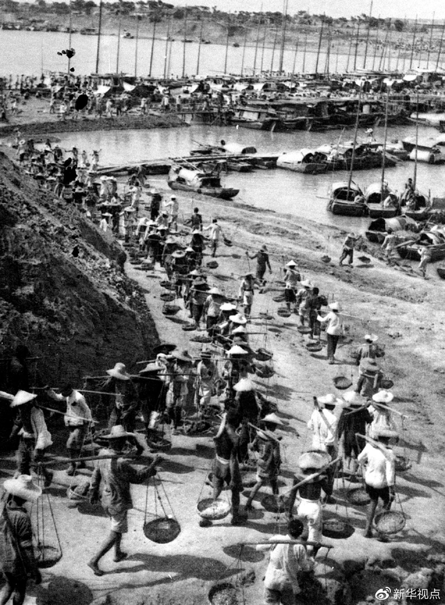 民工在安徽潤河集蓄洪分水閘工地施工(1951年攝,資料照片)。