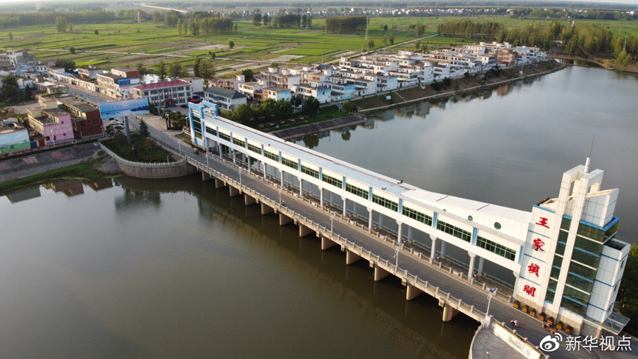 這是2020年8月15日拍攝的位于安徽省阜南縣的王家壩閘(無人機(jī)照片)。新華社記者 張端 攝