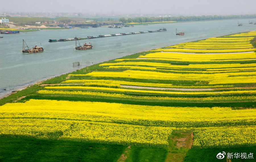 2008年3月27日,一支運(yùn)煤船隊(duì)通過岸邊開滿油菜花的淮河淮南段。金黃色的油菜花和綠油油的麥苗使得淮河岸邊美景如畫。新華社發(fā)(陳彬攝)
