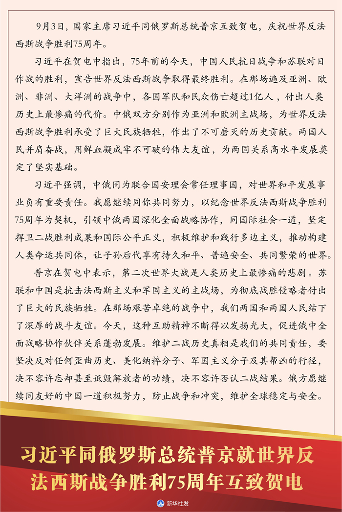 習(xí)近平在賀電中指出,75年前的今天,中國人民抗日戰(zhàn)爭和蘇聯(lián)對日作戰(zhàn)的勝利,宣告世界反法西斯戰(zhàn)爭取得最終勝利。在那場遍及亞洲、歐洲、非洲、大洋洲的戰(zhàn)爭中,各國軍隊(duì)和民眾傷亡超過1億人,付出人類歷史上最慘痛的代價。中俄雙方分別作為亞洲和歐洲主戰(zhàn)場,為世界反法西斯戰(zhàn)爭勝利承受了巨大民族犧牲,作出了不可磨滅的歷史貢獻(xiàn)。兩國人民并肩奮戰(zhàn),用鮮血凝成牢不可破的偉大友誼,為兩國關(guān)系高水平發(fā)展奠定了堅實(shí)基礎(chǔ)。