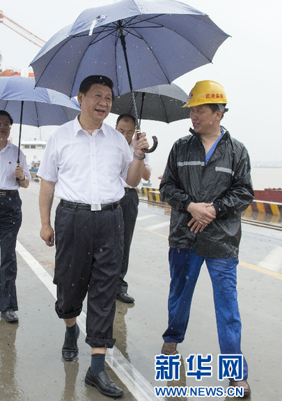 2013年7月,習(xí)近平來到武漢考察,一下飛機(jī)就冒雨來到武漢新港陽邏集裝箱港區(qū)。