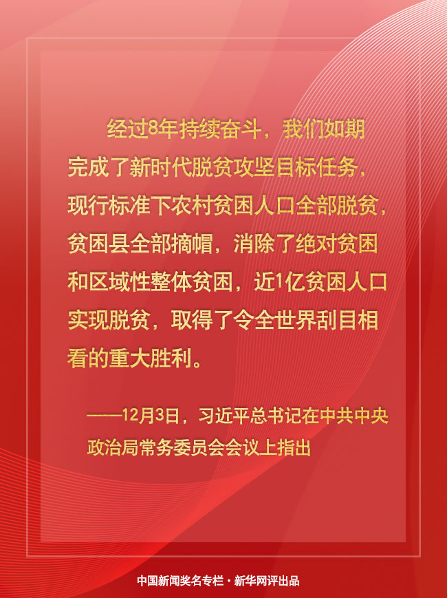 中共中央政治局常務(wù)委員會(huì)12月3日召開會(huì)議,聽取脫貧攻堅(jiān)總結(jié)評(píng)估匯報(bào)。習(xí)近平總書記在會(huì)上指出,經(jīng)過8年持續(xù)奮斗,我們?nèi)缙谕瓿闪诵聲r(shí)代脫貧攻堅(jiān)目標(biāo)任務(wù),現(xiàn)行標(biāo)準(zhǔn)下農(nóng)村貧困人口全部脫貧,貧困縣全部摘帽,消除了絕對(duì)貧困和區(qū)域性整體貧困,近1億貧困人口實(shí)現(xiàn)脫貧,取得了令全世界刮目相看的重大勝利。