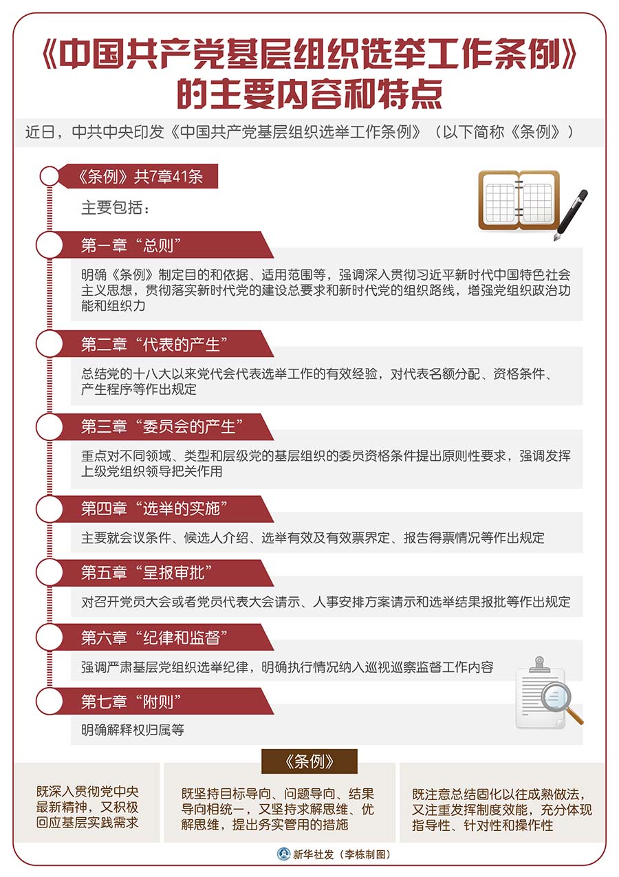 答:《條例》共7章41條,主要包括:第一章“總則”,明確《條例》制定目的和依據(jù)、適用范圍等,強(qiáng)調(diào)深入貫徹習(xí)近平新時代中國特色社會主義思想,貫徹落實(shí)新時代黨的建設(shè)總要求和新時代黨的組織路線,增強(qiáng)黨組織政治功能和組織力。第二章“代表的產(chǎn)生”,總結(jié)黨的十八大以來黨代會代表選舉工作的有效經(jīng)驗(yàn),對代表名額分配、資格條件、產(chǎn)生程序等作出規(guī)定。第三章“委員會的產(chǎn)生”,重點(diǎn)對不同領(lǐng)域、類型和層級黨的基層組織的委員資格條件提出原則性要求,強(qiáng)調(diào)發(fā)揮上級黨組織領(lǐng)導(dǎo)把關(guān)作用。第四章“選舉的實(shí)施”,主要就會議條件、候選人介紹、選舉有效及有效票界定、報(bào)告得票情況等作出規(guī)定。第五章“呈報(bào)審批”,對召開黨員大會或者黨員代表大會請示、人事安排方案請示和選舉結(jié)果報(bào)批等作出規(guī)定。第六章“紀(jì)律和監(jiān)督”,強(qiáng)調(diào)嚴(yán)肅基層黨組織選舉紀(jì)律,明確執(zhí)行情況納入巡視巡察監(jiān)督工作內(nèi)容。第七章“附則”,明確解釋權(quán)歸屬等。