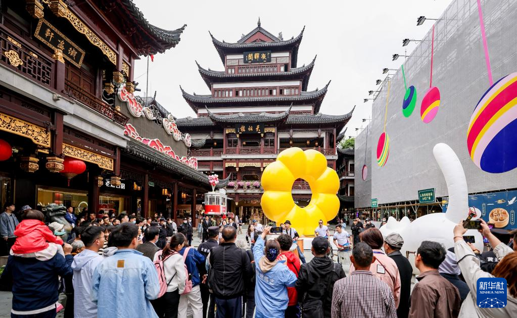 5月7日,市民游客在豫园商城中心广场观看街头艺术表演。