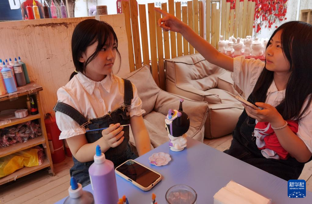 5月10日,两名年轻人在山东济宁环西北里文创街区体验手工项目。