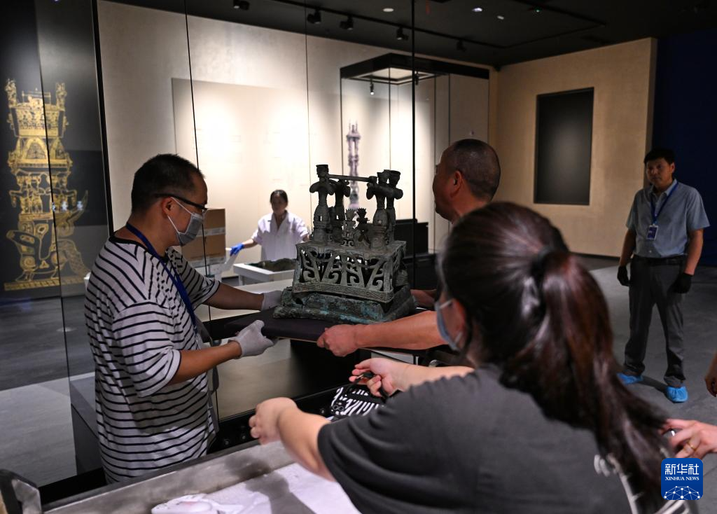 7月26日,工作人员在三星堆博物馆新馆内布展。